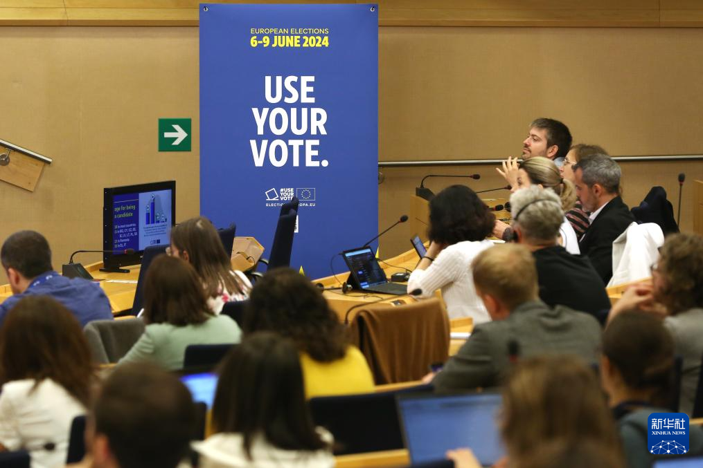6月6日,在位于比利时布鲁塞尔的欧洲议会,媒体记者参加选举投票情况介绍会。新华社记者 赵丁喆 摄