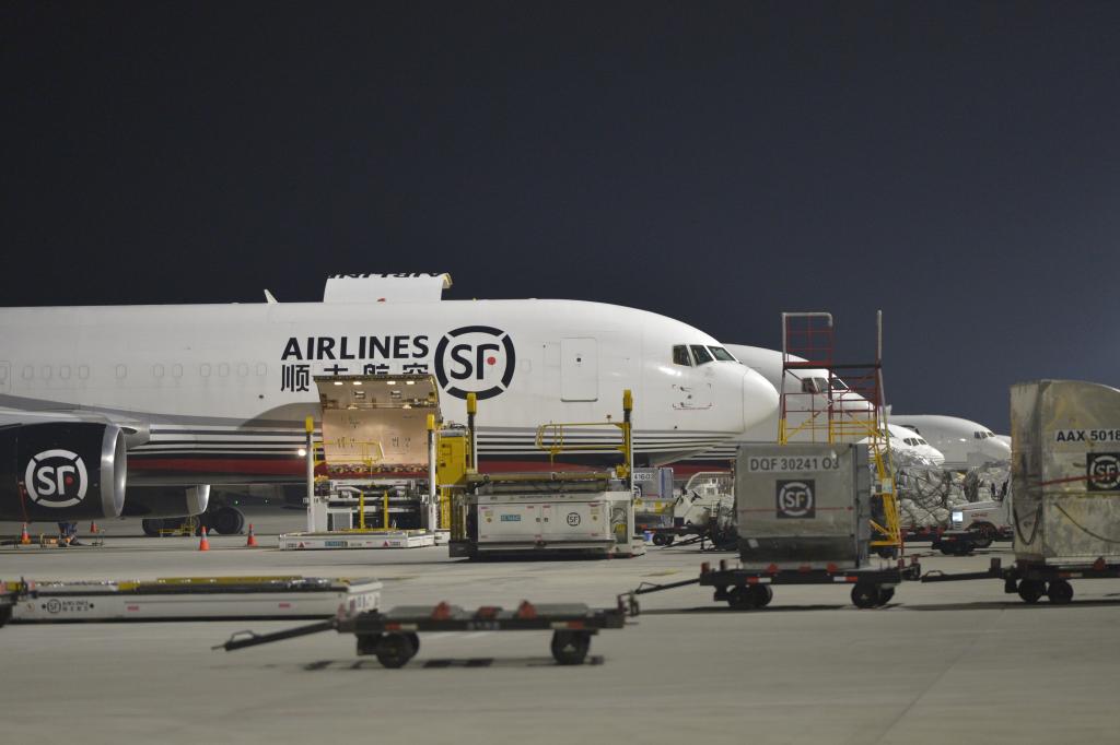 6月2日凌晨,货运航班正在花湖机场卸货。新华社记者刘力航 摄