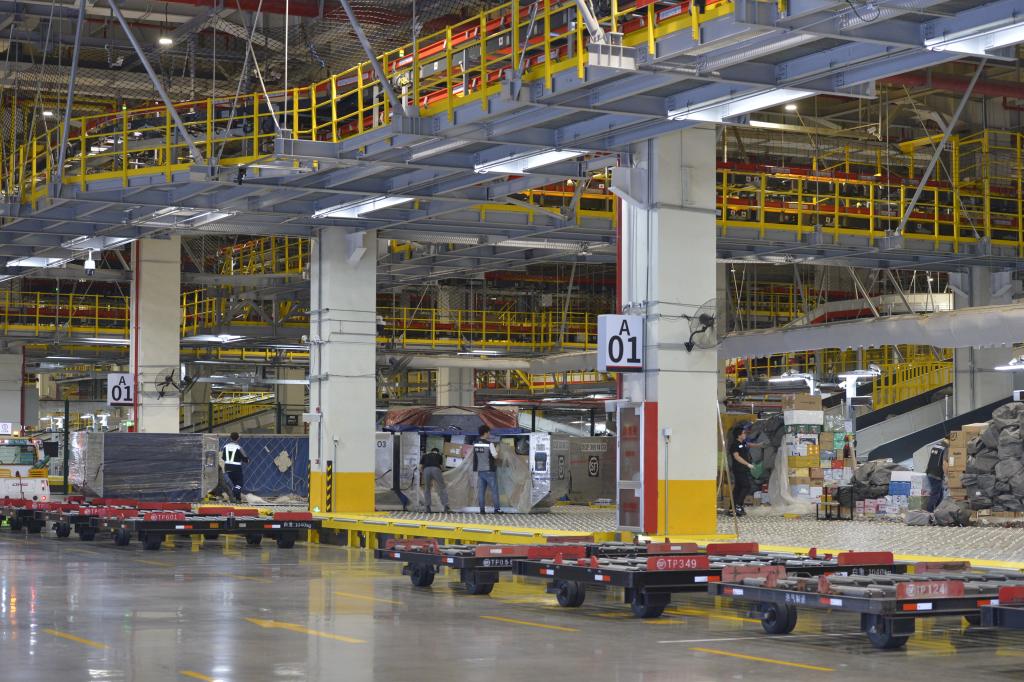 工作人员介绍,转运中心从规划设计、施工建造到运营管理,全生命周期运用数字施工与智慧建造技术,应用BIM(建筑信息模型)技术、科学仿真等多项前沿科技,自主研发和引入5类31项分拣设备及管理系统,管理系统集成航空、塔台、地面、分拣、海关等信息,内外作业高效协同。