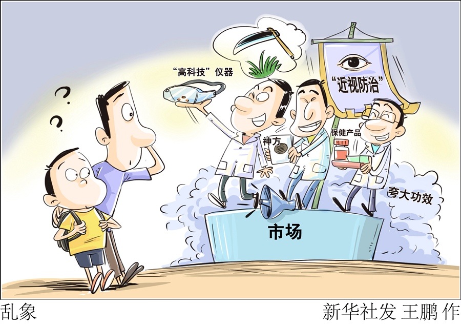扯上“权威专家研发”“重点项目支持”等幌子,兜售所谓的“高科技”仪器;打着“传统中医药”的旗号,把眼部按摩、中药热敷、穴位刺激等吹成神方;夸大产品功效,把普通叶黄素、蓝莓饮料、明目贴等产品卖出高价……近年来,打着“近视防治”旗号、紧盯家长钱包的各类套路、花样层出不穷,各种市场乱象屡禁不止。