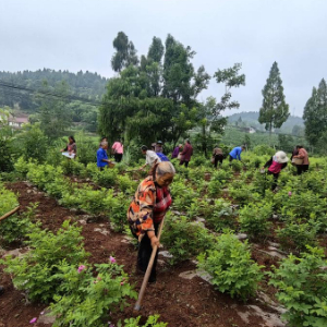 6月5日,记者走进四川省内江市东兴区高梁镇方家沟村,眼前是碧绿的荷塘、飘香的玫瑰、成片的紫苏、大豆、车前草等作物……村民们正趁着雨后泥土松软,在食用玫瑰之间播种大豆。