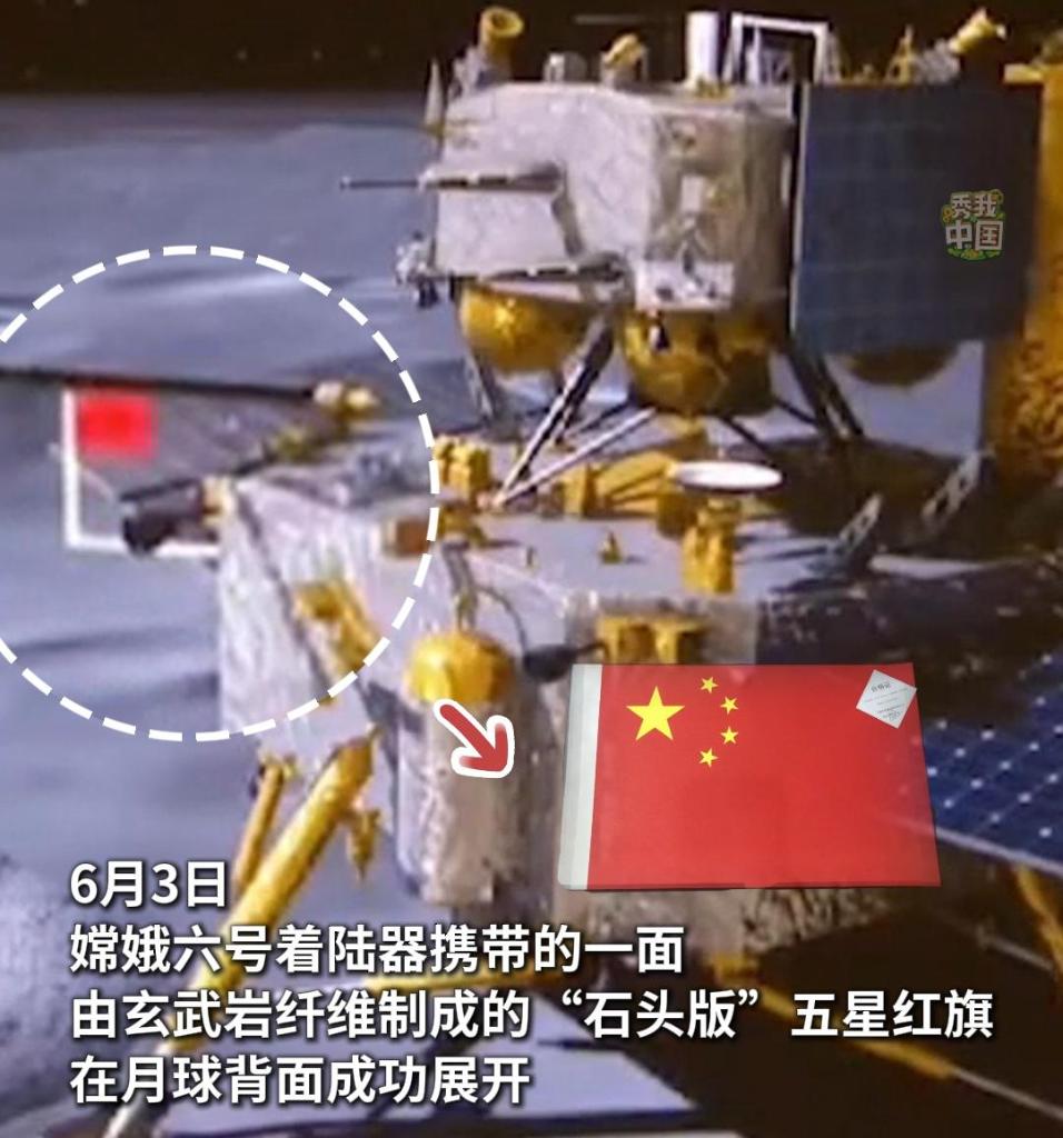 6月3日,嫦娥六号着陆器携带的一面由玄武岩纤维制成的“石头版”五星红旗,在月球背面成功展开。