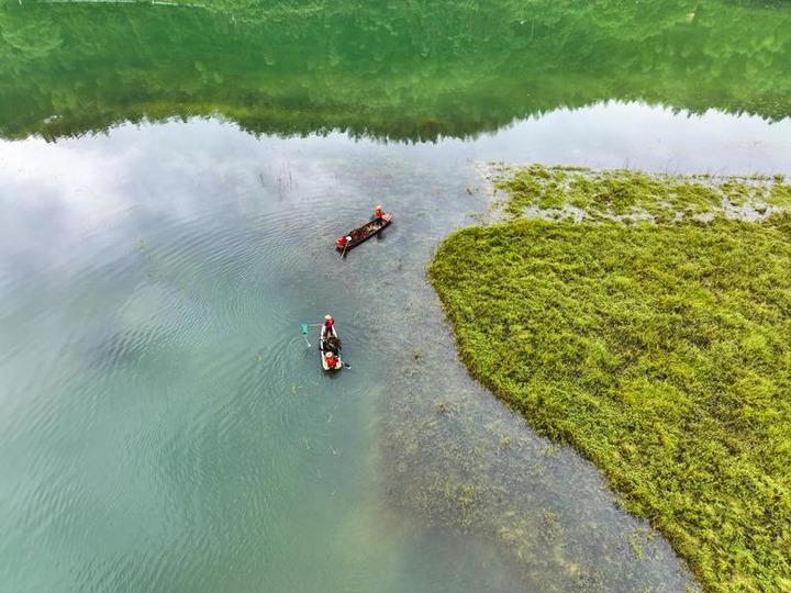 6月5日,志愿者在湖南省常宁市洋泉水库清理水面漂浮物。 新华社发(周秀鱼春摄)