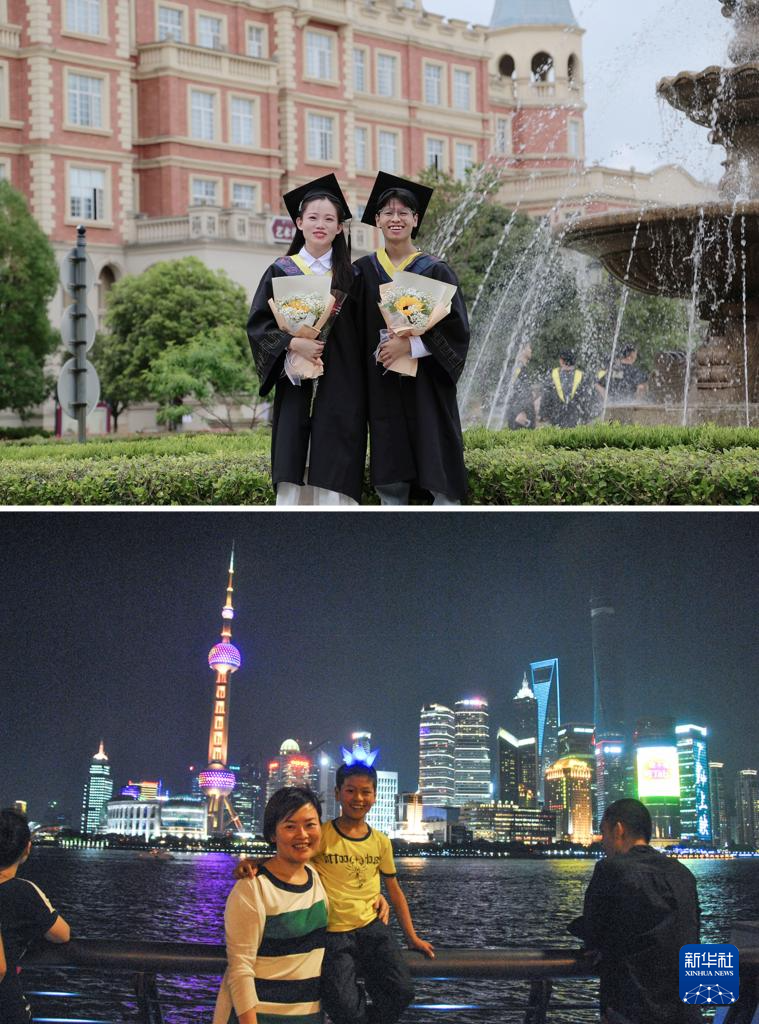 拼版照片:上图为2024年5月21日,邓广伟与同学穿着学士服在贵州黔南科技学院合影留念(采访对象供图);下图为2014年7月29日,邓广伟与爱心人范女士在上海外滩合影。