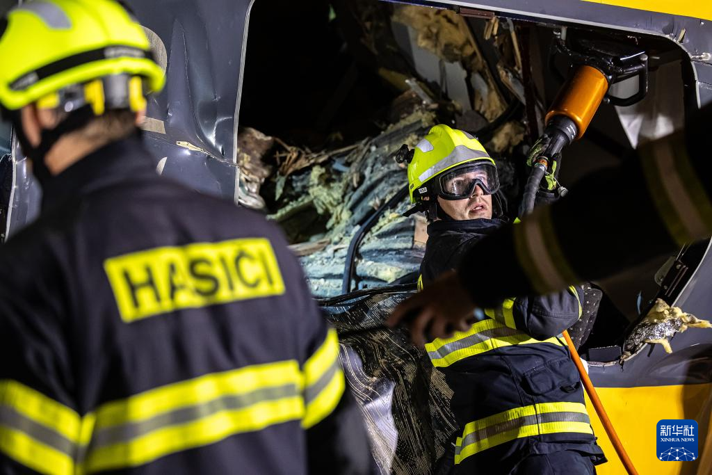 这张捷克消防和救援服务部门6月6日提供的照片显示,救援人员在捷克东北部城市帕尔杜比采的列车相撞事故现场工作。新华社发(米哈尔·凡塔摄/捷克消防和救援服务部门供图)