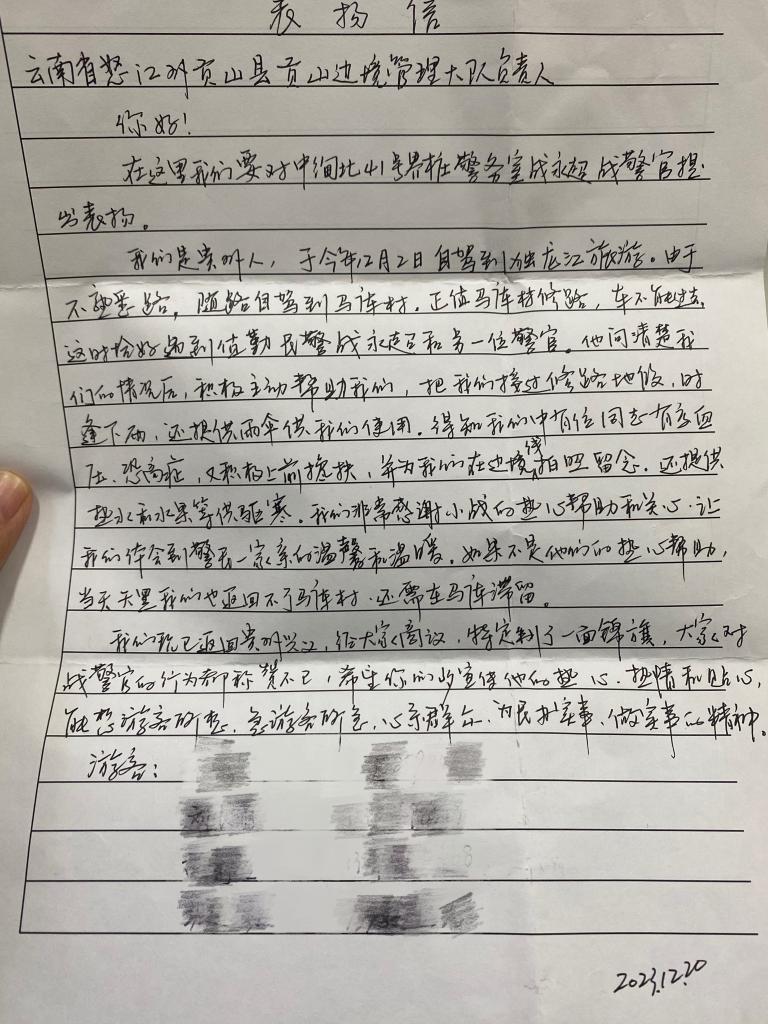 这封手写的表扬信,战永超一直小心保存着。“想游客之所想,急游客之所急”,这是群众的心声,也是云南移民管理警察的日常。