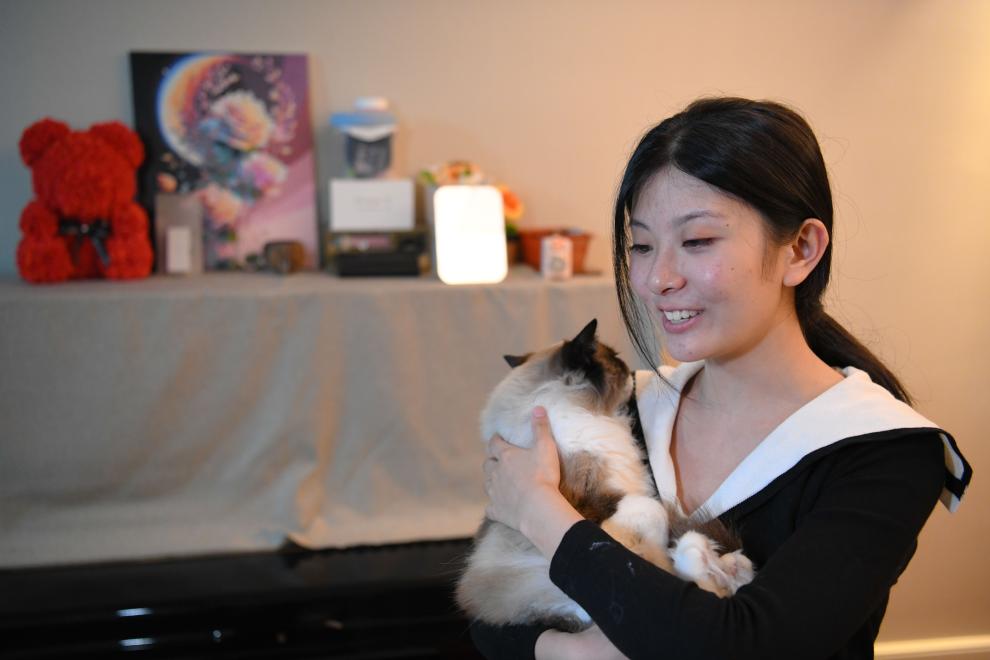 5月27日,在安徽省合肥市,郁晓楠和家里养的小猫互动。