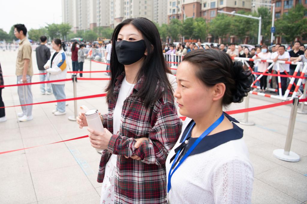 6月7日,在安徽省合肥市的一处高考考点,一名工作人员准备将郁晓楠(前左)带进考场。