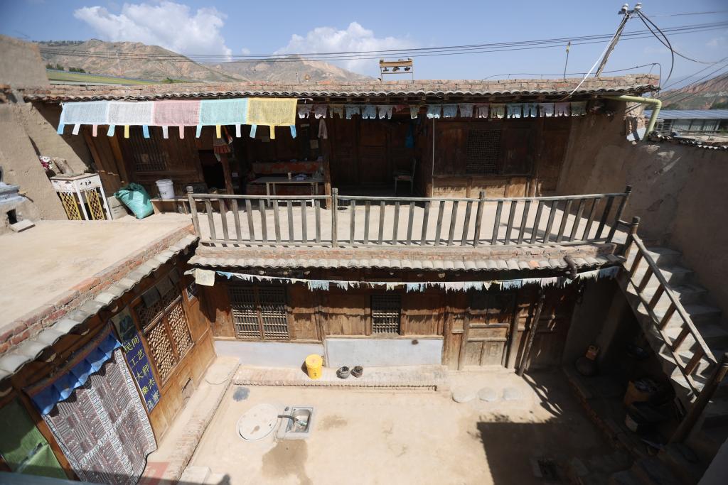 丹布古宅见证着古堡的历史变迁,距今已有600多年历史。“这是村里现存最完整的一座古宅,木门和木窗都是古法制作的。”61岁的村民完德卡告诉记者,古堡内民宅的建筑风格多为土木二层结构的“廊房式”建筑,一般底层平房为家中长辈居住,有厨房、储藏室和牲畜圈房,二层廊房为晚辈居住,有佛堂、卧室和储藏室。
