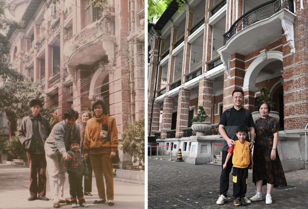 杜煜杰手拿一张老照片,携母亲和儿子重回广州荔湾区沙面大街旧居楼前,30多年后再拍合影时,回忆瞬间涌上心头:“我清楚地记得当时全家人要去广州文化公园观赏菊展,出发前,我们拍下了这张彩色合照。”