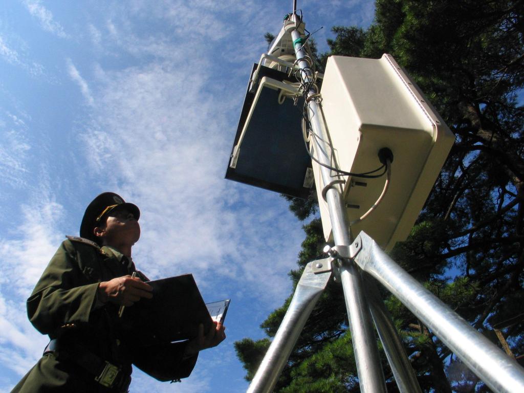 2004年8月5日,第16任守松人沈成效在迎客松后面的自动气象监测站记录有关数据。