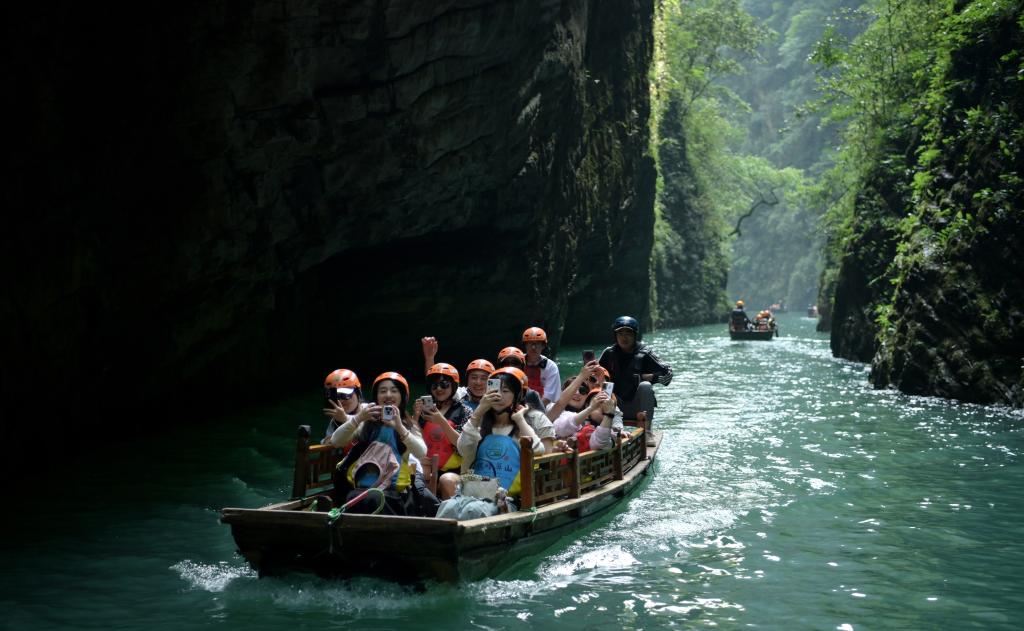 5月28日,游人在鹤峰县屏山旅游景区乘坐小船游玩。新华社发(杨顺丕摄)