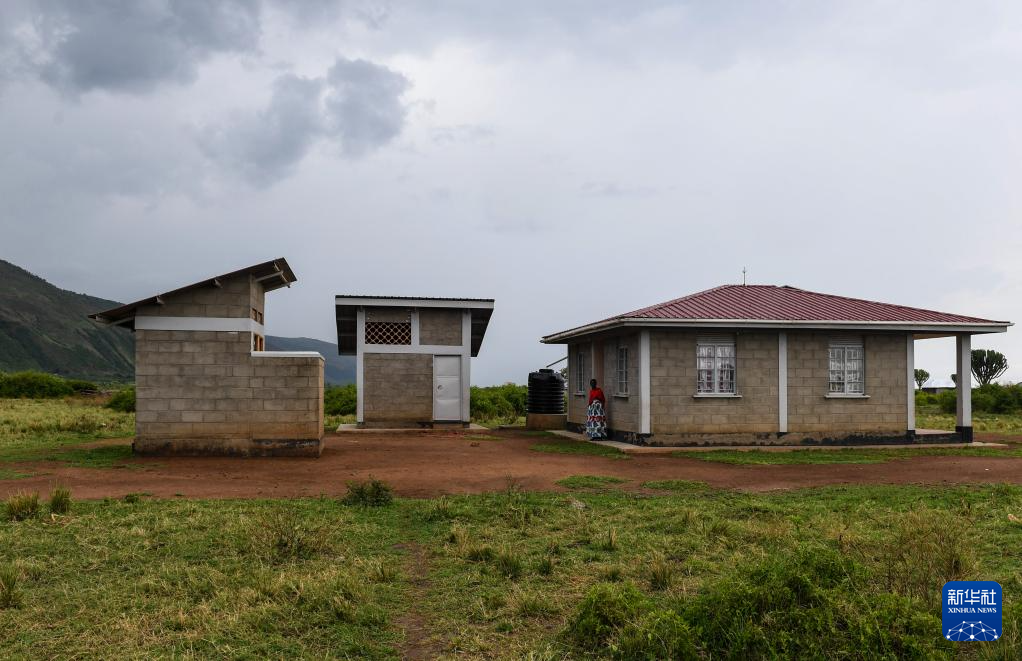4月2日,在乌干达西部边境艾伯特湖畔的翠鸟油田项目所在地附近,一名当地居民站在自家安置房前。新华社记者 李亚辉 摄