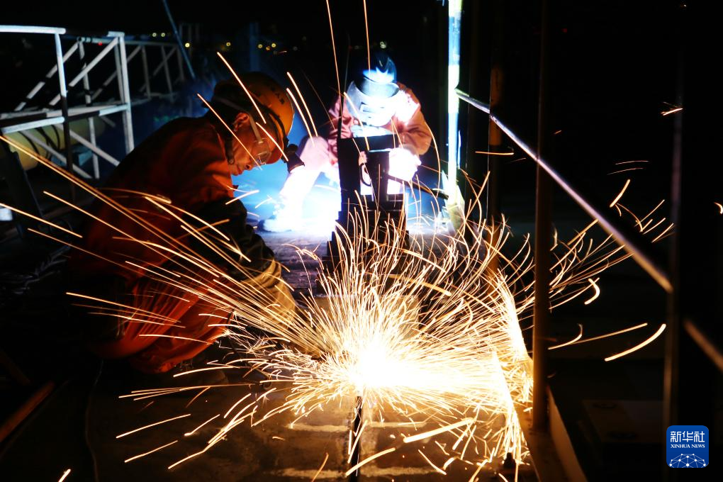 6月8日晚,大桥建设者在常泰长江大桥主航道桥合龙段对焊缝进行打磨和焊接作业。新华社发(陈暐 摄)