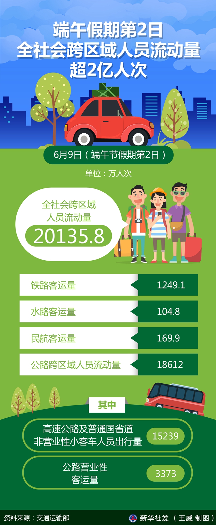 新华社北京6月10日电(记者 王聿昊)记者10日从交通运输部获悉,6月9日(端午节假期第2日),全社会跨区域人员流动量为20135.8万人次。