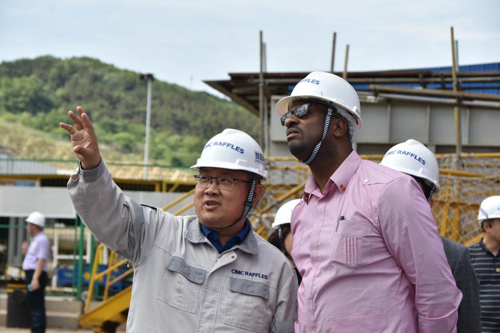 6月8日,驻华使节在中集来福士海洋工程有限公司烟台基地了解海工装备制造有关情况。新华社记者丛佳鑫 摄