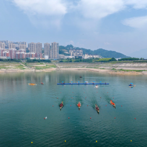 6月10日,湖北省宜昌市秭归县在三峡大坝坝前举行2024屈原故里传统龙舟赛,这是龙舟队伍在赛前进行游江仪式(无人机照片)。