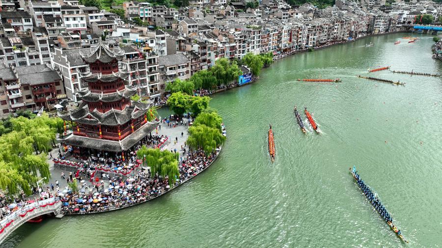 6月10日,龙舟队伍在贵州省黔东南苗族侗族自治州镇远县㵲阳河上巡游(无人机照片)。