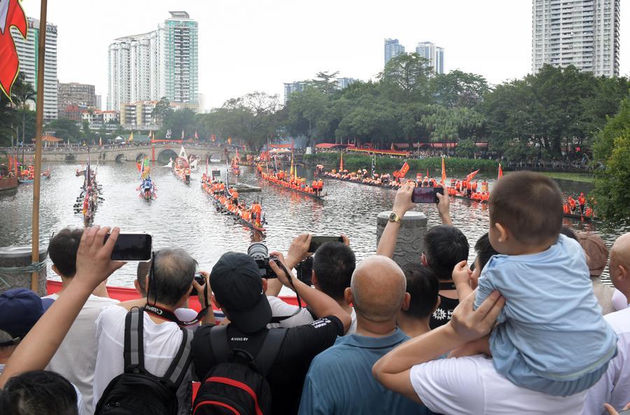 6月10日,在广州市荔枝湾参加活动的龙舟队伍在进行巡游。