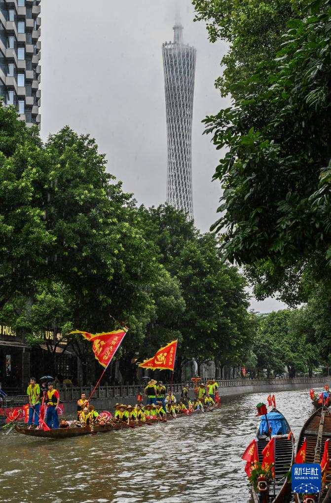 6月10日,猎德村热闹的传统龙舟“龙船景”与繁忙的现代都市交汇相融(无人机照片)。“龙船景”是广府地区水乡在端午期间举办的一种民俗活动。