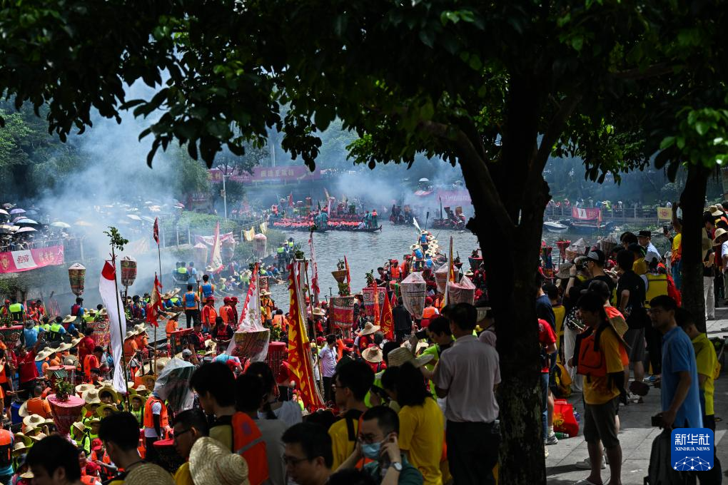 6月10日,国内外游客汇聚在猎德观赏“龙船景”。“龙船景”是广府地区水乡在端午期间举办的一种民俗活动。