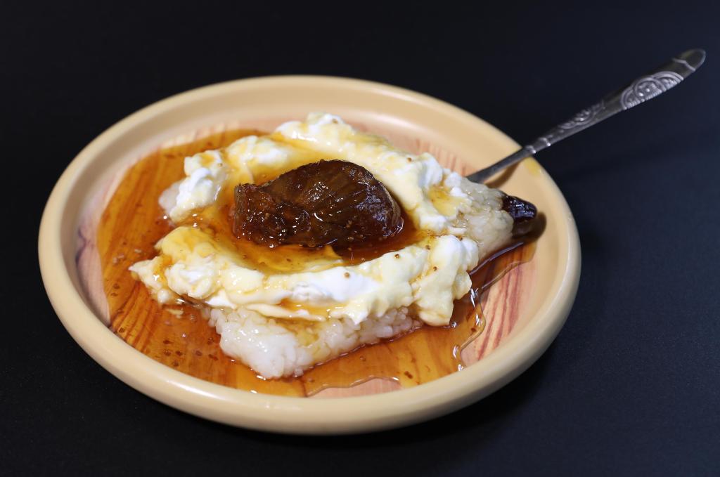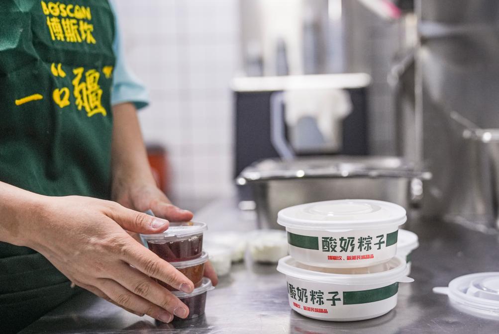 在北京一家餐厅,工作人员为顾客送上酸奶粽子。