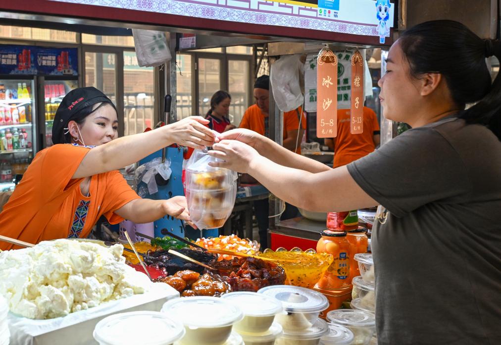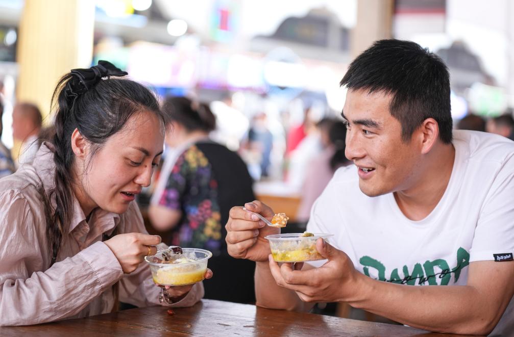 人们在位于乌鲁木齐市的大巴扎美食街品尝酸奶粽子。