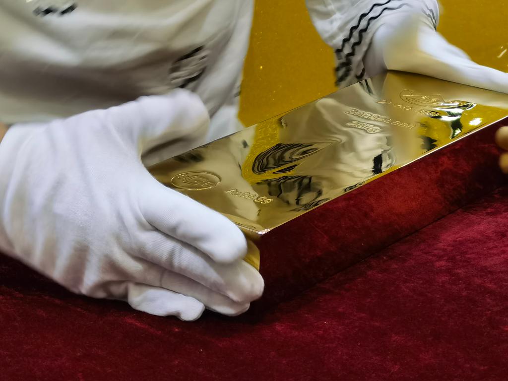这是5月9日在山东招金金银精炼公司拍摄的金砖。新华社记者任军 摄