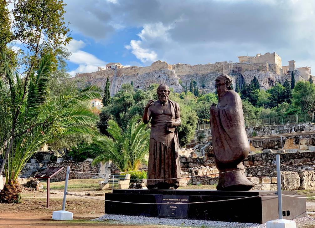 如今,在雅典古集市遗址上,吴为山创作的组雕《神遇——孔子与苏格拉底的对话》将孔子带到了苏格拉底的故乡。两位分别来自东西方的哲学巨人并肩站立,仿佛穿越地理与时间界限,产生思想碰撞与交汇。