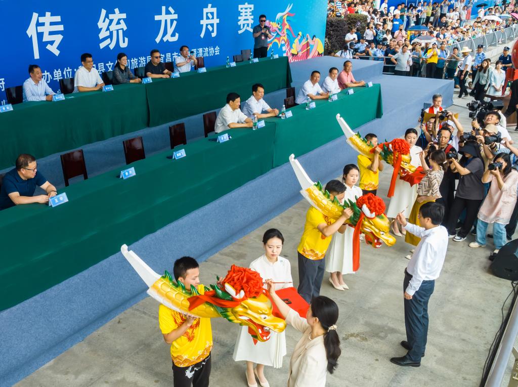 6月10日,湖北省宜昌市秭归县举办2024屈原故里传统龙舟赛,嘉宾为龙舟点睛。新华社发(郑家裕摄)