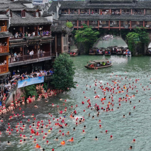 湘西凤凰,当地端午传统习俗历经百年依旧鲜活。在凤凰古城,沱江之上的龙舟竞渡和“抢鸭子”活动再现了沈从文《边城》中的热闹场面——500只活泼的鸭子被投入江中,头戴小红帽的游泳健儿们迅速跃入水中,展开一场速度与智慧的较量。