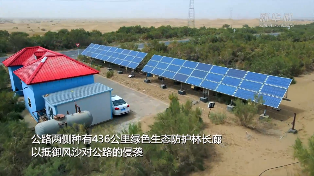 2022年6月,塔里木沙漠公路零碳示范工程建成投产,在公路两旁新建86座光伏电站,依托109口水源井对沿线3100多公顷生态防护林进行灌溉。