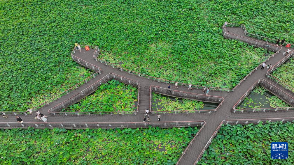 6月10日,游人在四川省遂宁市圣莲岛赏荷游玩、拍照打卡(无人机照片)。