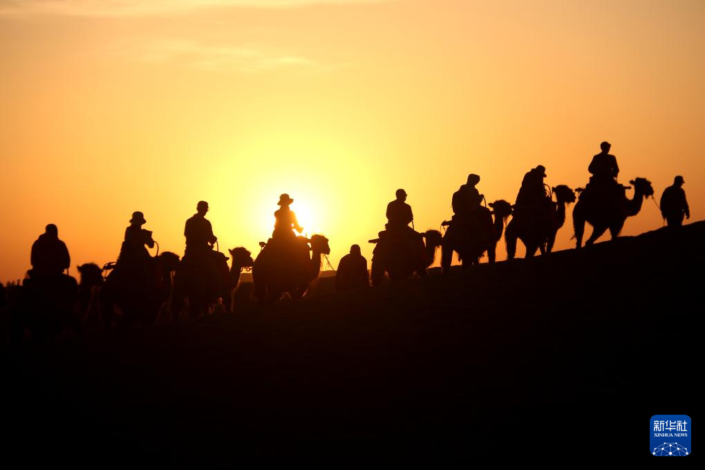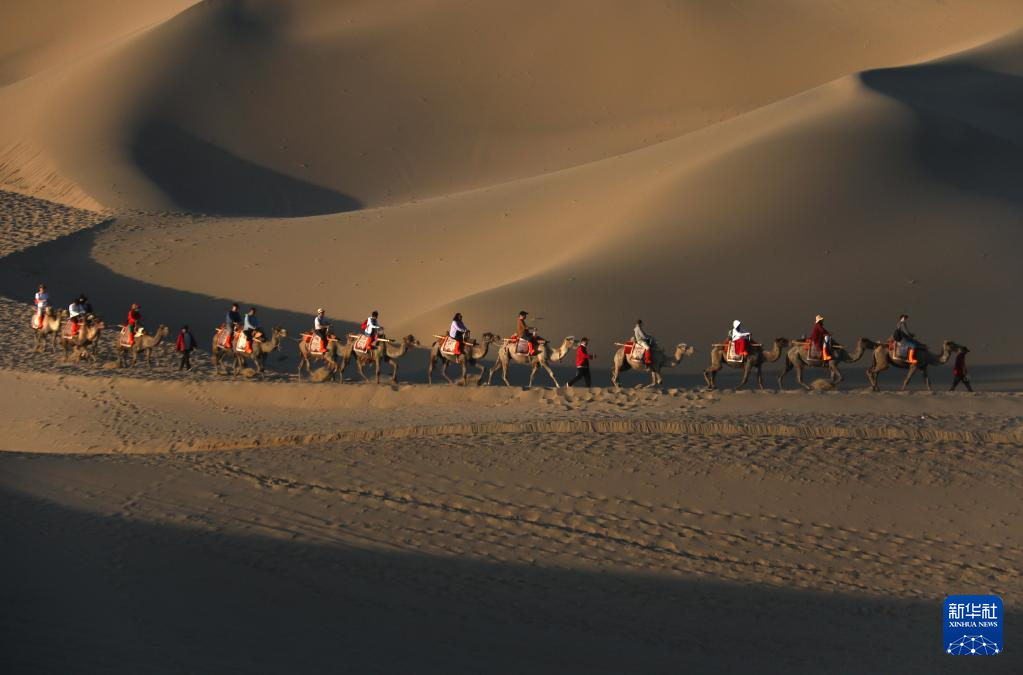 6月9日,游客在甘肃省敦煌市鸣沙山月牙泉景区游览。