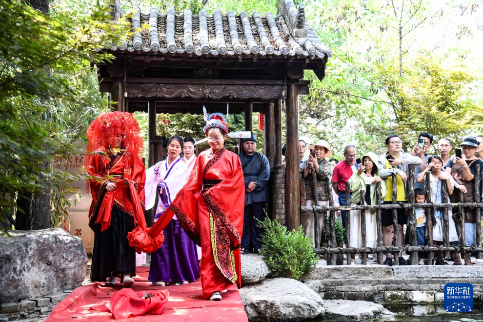 6月10日,游客在河南省济源市王屋山景区王屋老街观看”王府招亲“表演。
