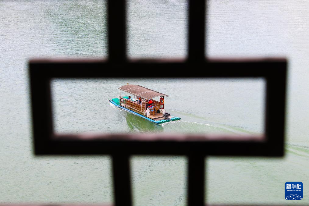 6月10日,游客在重庆市黔江区濯水古镇乘坐电动竹筏畅游阿蓬江。