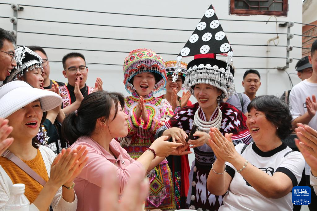 6月10日,在云南水富市两碗镇三角村,身着苗族服装的当地人向游客敬上苗家米酒。