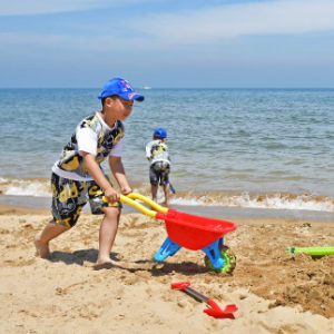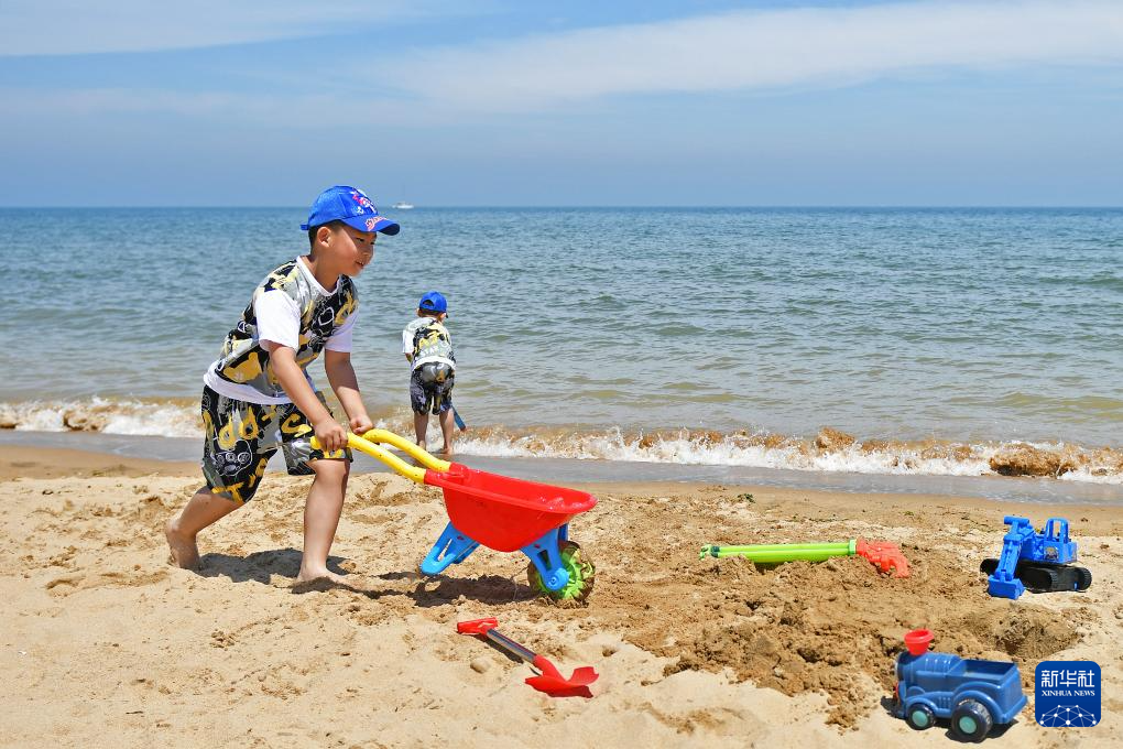 6月10日,小朋友在山东烟台黄渤海新区金沙滩海水浴场戏水玩沙。