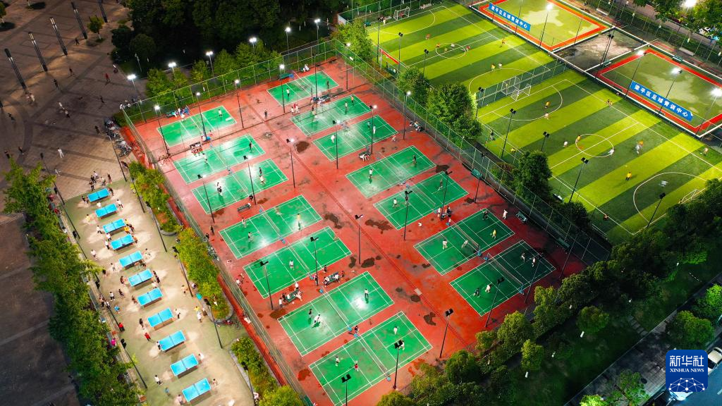 6月9日晚,重庆市梁平区双桂湖体育公园灯火通明,市民参加体育活动,享受运动快乐(无人机照片)。