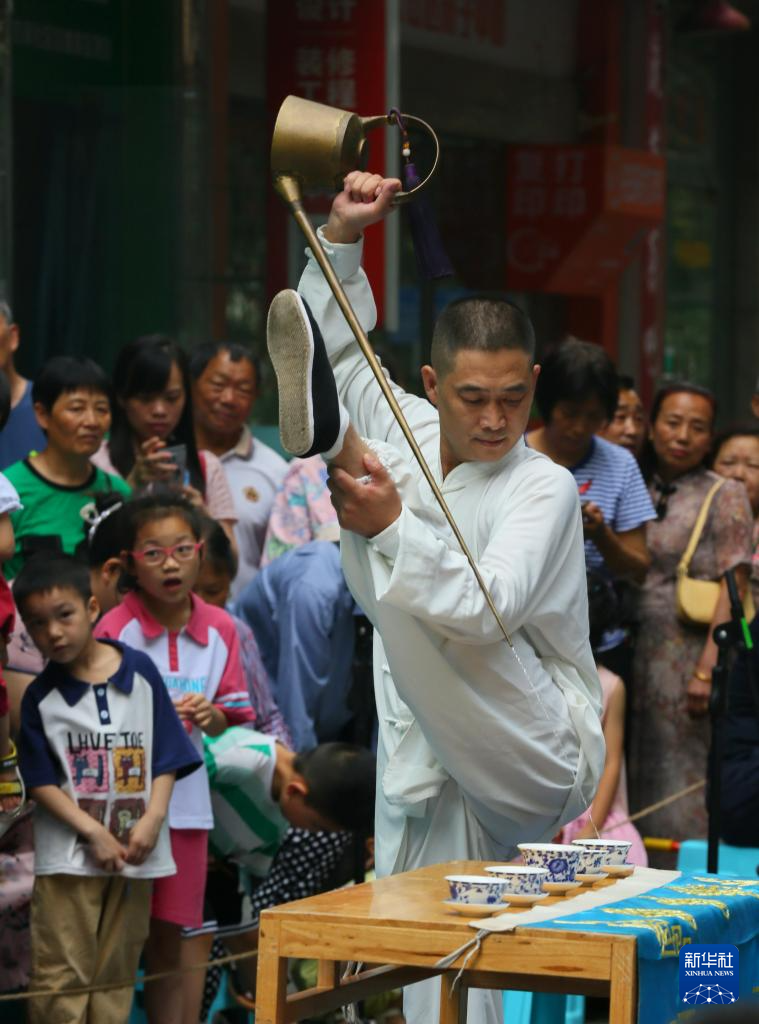 6月10日,在四川省遂宁市河东新区杰灵社区,游客观看川剧团演员表演“长嘴壶茶艺”。