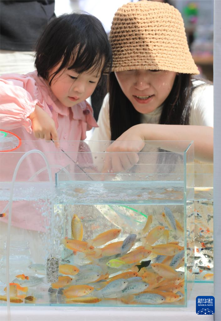 6月10日,在云南腾冲市文治光昌广场举办的“端阳花市”上,一对母女在选购金鱼。