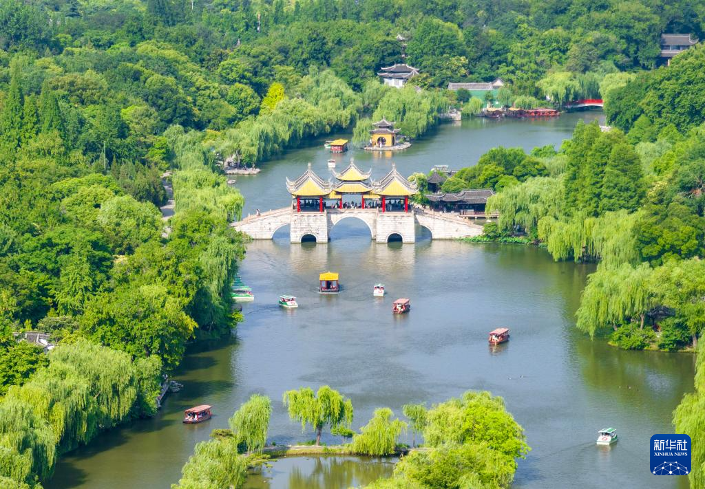 6月10日,游客在江苏扬州瘦西湖风景区游览(无人机照片)。