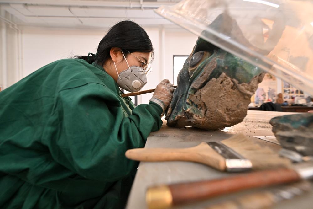 2月26日,在云冈研究院可移动文物修复室,工作人员正在进行除尘作业。(新华社记者 詹彦 摄)