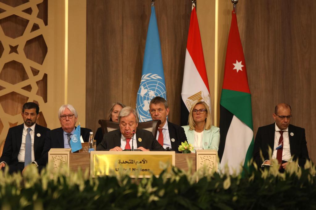 6月11日,在位于约旦死海畔的约旦侯赛因国王会议中心,联合国秘书长古特雷斯(前)出席加沙紧急人道主义应对会议时发言。新华社发(穆罕默德·阿布·古什摄)