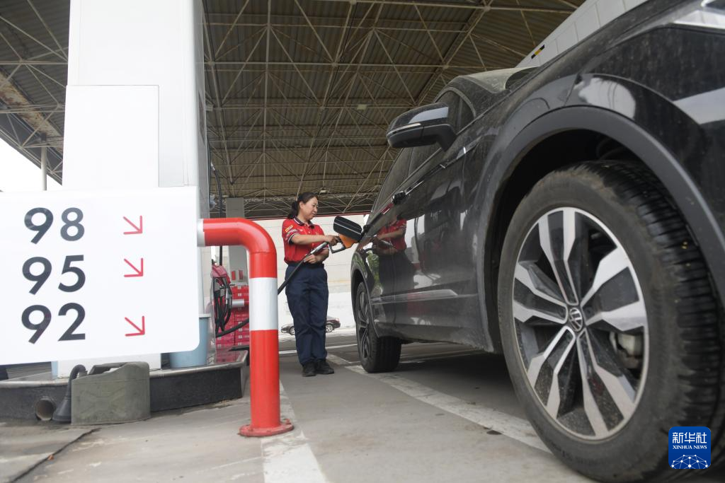 6月13日,河北省新乐市一家加油站的工作人员给汽车加油。新华社发(贾敏杰 摄)