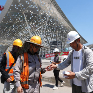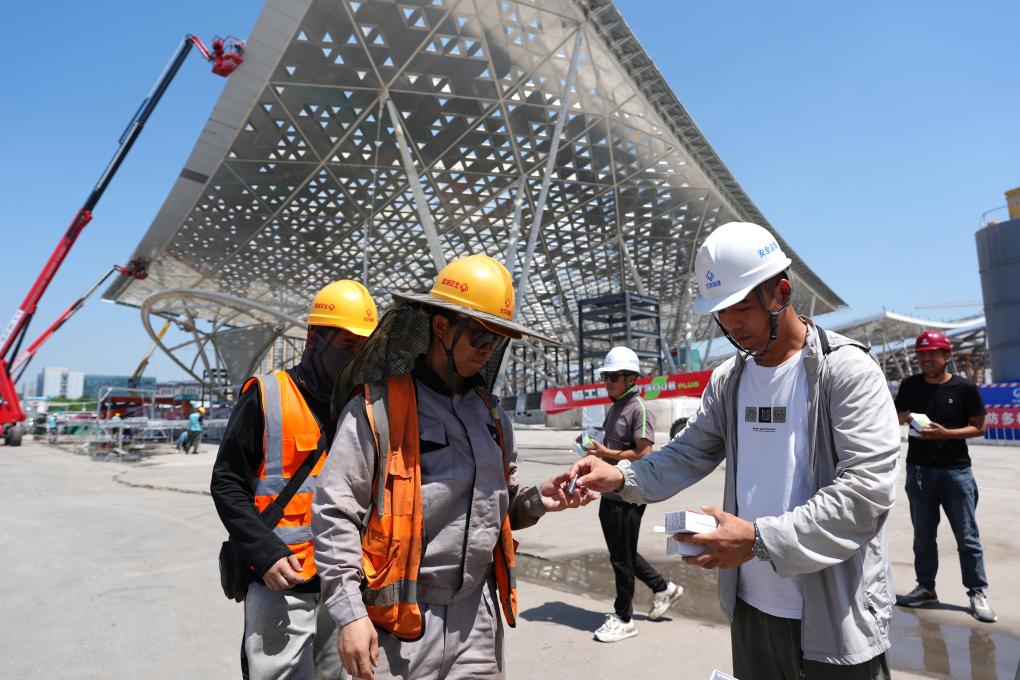 6月12日,在北京城市副中心站综合交通枢纽工程施工现场,北京城建集团的施工人员(左)在领取藿香正气水。新华社记者鞠焕宗 摄