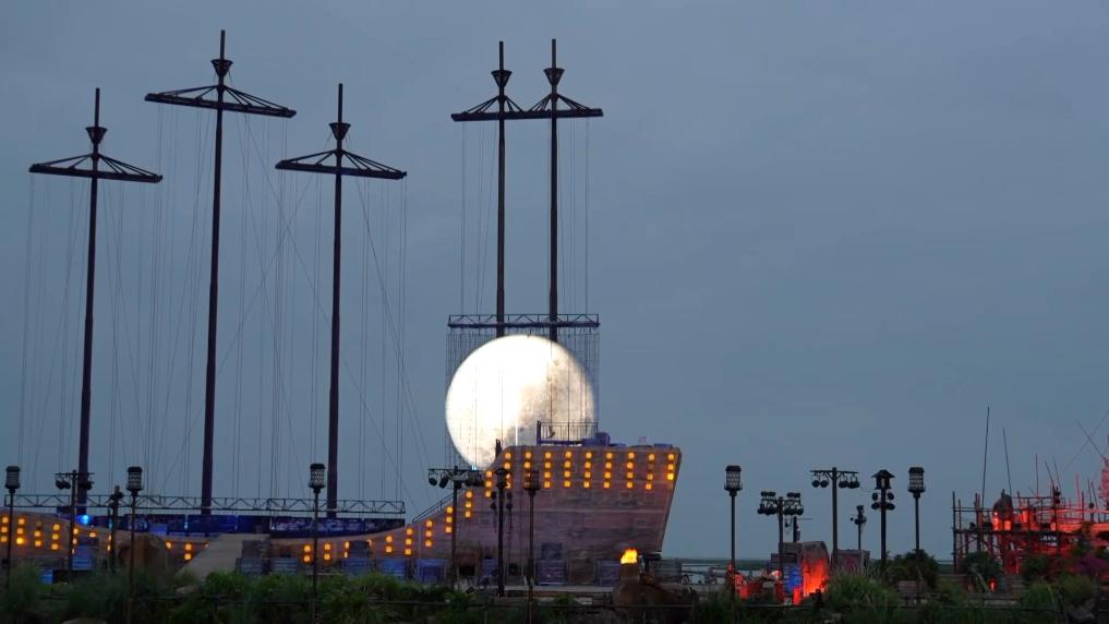 夜幕降临,北部湾畔,一座“渔港”华灯初上,点亮了这里的雕栏玉砌。傍晚六点,西班牙姑娘克劳迪娅换上了颇具西域风情的服装,开始了她今晚的演出。克劳迪娅参演的戏剧,讲述了两千多年前广西合浦这座海上丝绸之路早期始发港的故事。