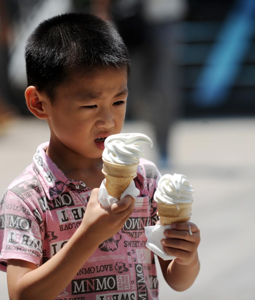 2013年7月13日是入伏第一天,一名孩子拿着冰淇淋行走在江西南昌市步行街。