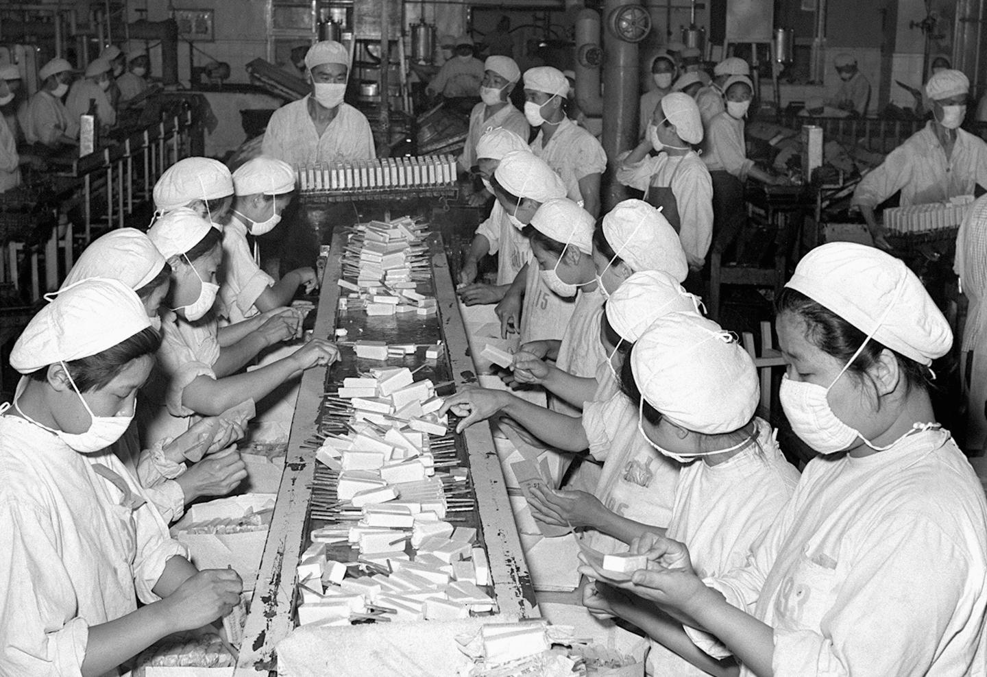 1959年6月,北京市食品厂工人在包装冰棍。