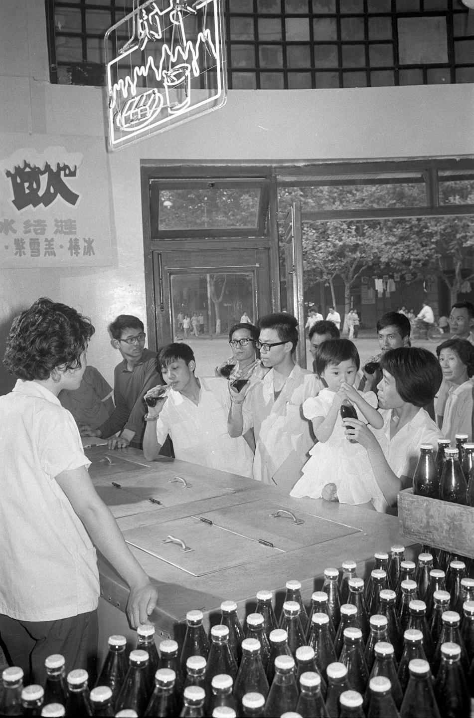 1983年8月,持续高温,冷饮畅销,北京前门大街迎时冷饮店的售货员忙着出售北冰洋汽水。
